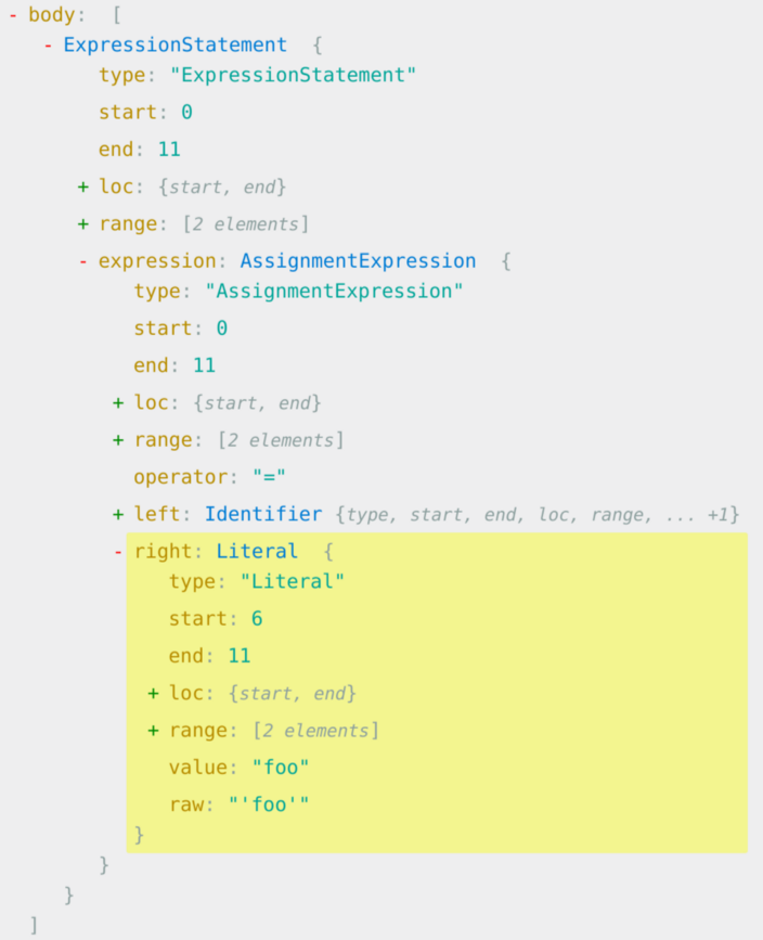 As you can see, each node in the tree represents a part of the code, and it’s recursive. The assignment expression foo = "foo" uses the operator =, the operand on the left is an identifier named foo and the operand on the right is a literal with the value "foo". So that’s how it goes, each part of the code can be presented as a node which is made out of other nodes, each node has a type and additional properties based on its type.